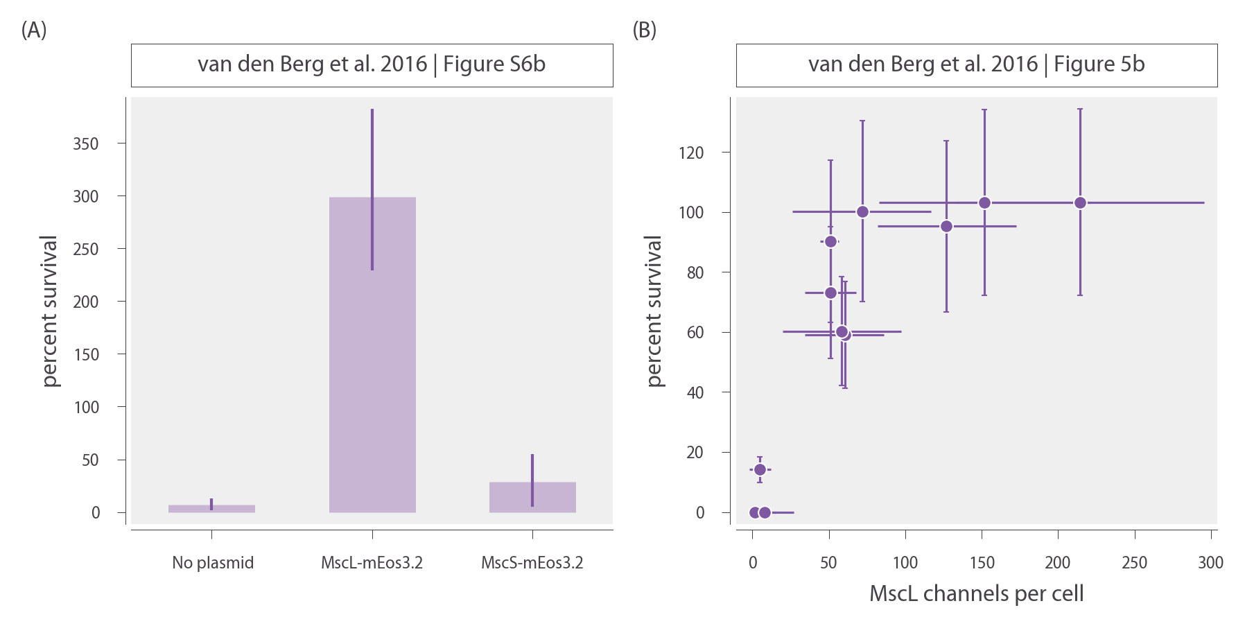 In van den Berg et al. (2016), the authors report a 100% survival rate at approximately 100 channels per cell. While the number of mechanosensitive channels per cell was quantified at the level of single cells, the survival probability was measured in bulk using ensemble plating assays. The results of these experiments considering the contribution of MscL to survival is shown in Figure 5 of their work, although without displayed uncertainty in the survival probability. Figure S6B of their work shows the approximate error in survival probability through ensemble plating assays for three different strains (Fig. 12 (A)), which is approximately 30%. Using this approximate error and the data shown in their Figure 5B, we have reproduced this plot with error bars in both measured dimensions (Fig. 12 (B)). This plot shows that even when the mean survival probability is 100%, the variation in the measured survival probability is large, extending as low as ≈ 70%. This variation is likely born from a multitude of experimental steps including time of outgrowth, variation in shock rate, plating efficiency, and counting errors. As our experimental approach directly measures the survival/death of individual cells, we remove many sources of error that would arise from an ensemble approach, albeit at lower throughput. While it is possible that the discrepancy between van den Berg et al. (2016) and the work presented in Chapter 5 could arise from other unknown factors, we believe that single-cell experiments introduce the fewest sources of error.