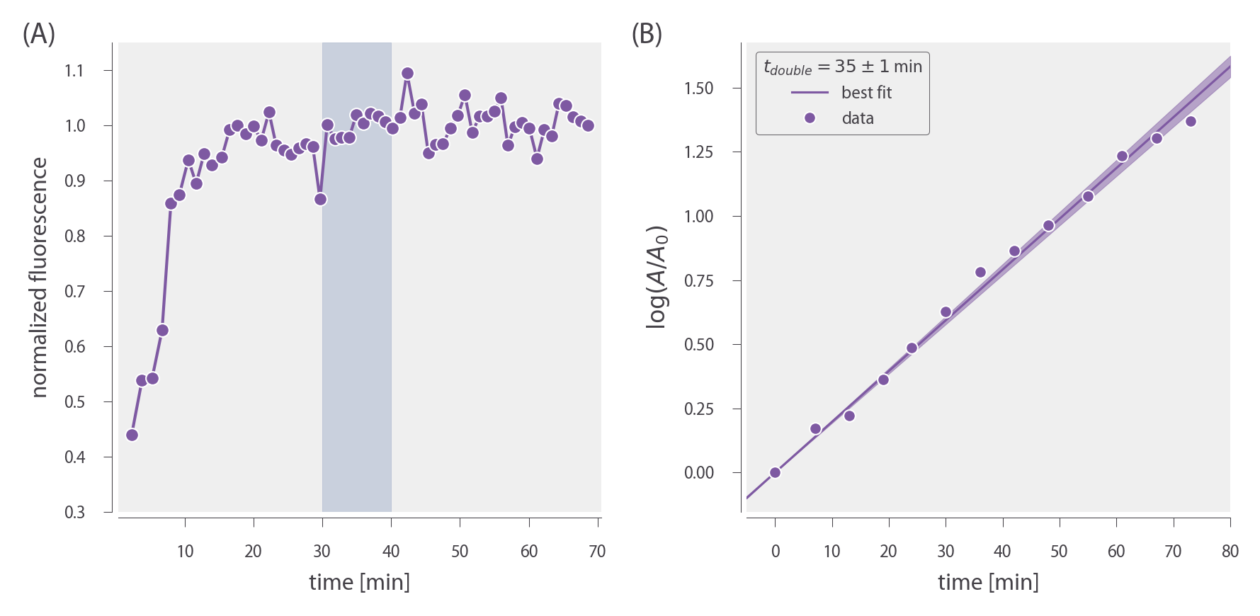 We observe complete maturation of the protein within 20 minutes after translation of the sfGFP gene was ceased. While the growth rate in LB + 500mM NaCl varies depending on the expression of MscL-sfGFP, we typically observe doubling times between 30 and 40 minutes, as indicated by an orange stripe in Fig. 2 (A). To examine the ``best case” scenario for cell growth in this medium, we measured the growth rate of the same E. coli strain used to measure the fluorophore maturation time (Fig. 2 B). We observed a doubling time of 35 ± 1 min, which falls in the middle of the yellow stripe shown in Fig. 2 A. These data, coupled with our previous quantification of MscL copy number using independent methods, suggests that the fluorescence measurements made in this work reflect the total amount of MscL protein expressed.