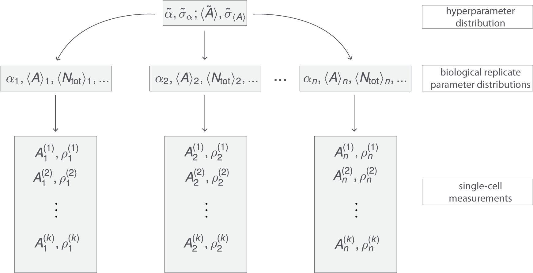 In the previous section, we assumed maximally uninformative priors for the most-likely values of α and ⟨A⟩. While this is a fair approach to take, we are not completely ignorant with regard to how these values are distributed across biological replicates. A major assumption of our model is that the most-likely value of α and ⟨A⟩ for each biological replicate are comparable, so long as the experimental error between them is minimized. In other words, we are assuming that the most-likely value for each parameter for each replicate is drawn from the same distribution. While each replicate may have a unique value, they are all related to one another. Unfortunately, proper sampling of this distribution requires an extensive amount of experimental work, making inferential approaches more attractive.