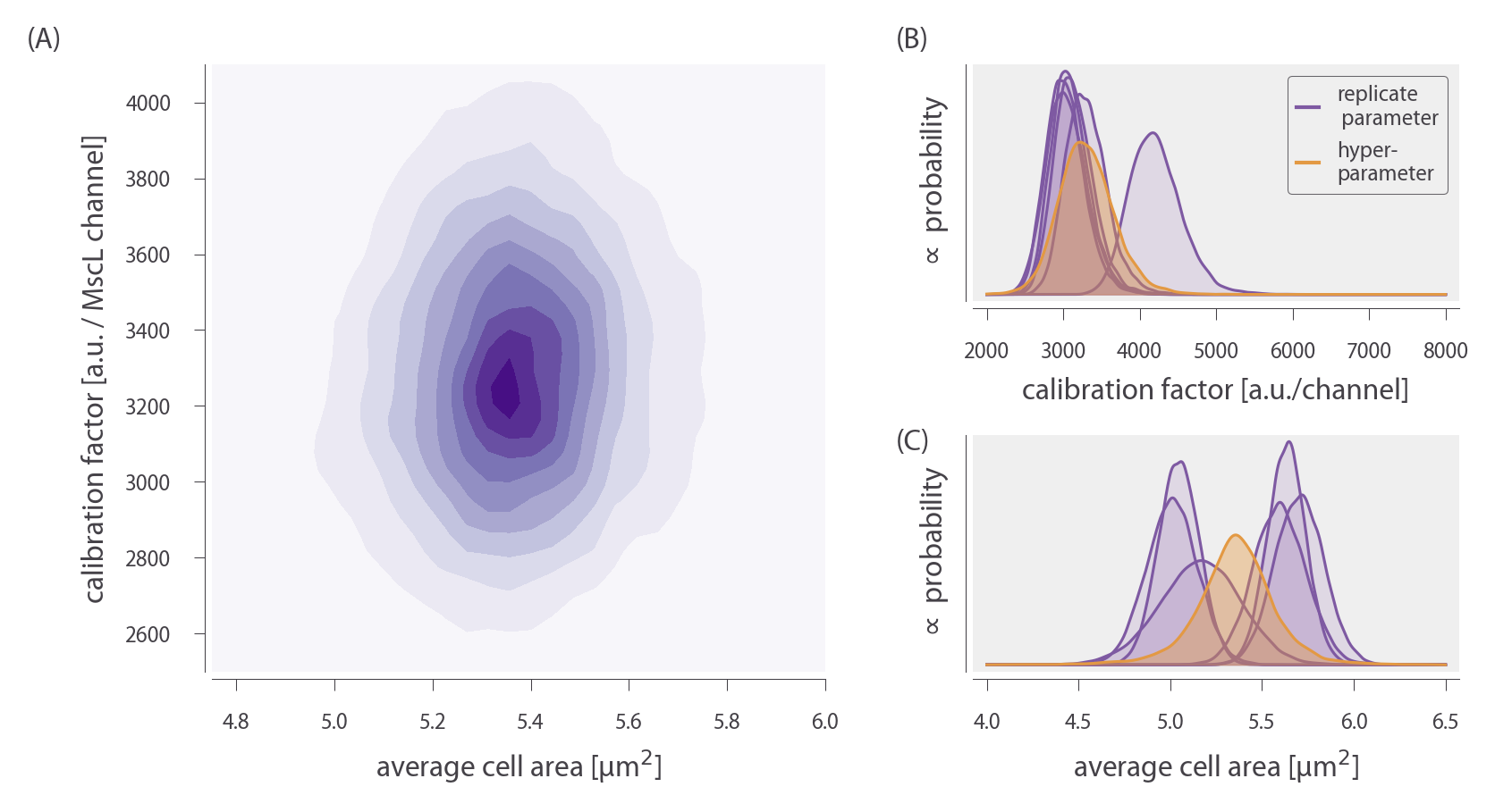 The choice for the functional form for the informative prior is often not obvious and can require other experimental approaches or back-of-the-envelope estimates to approximate. Each experiment in this work was carefully constructed to minimize the day-to-day variation. This involved adhering to well-controlled growth temperatures and media composition, harvesting of cells at comparable optical densities, and ensuring identical imaging parameters. As the experimental variation is minimized, we can use our knowledge of the underlying biological processes to guess at the approximate functional form. For similar reasons presented in the previous section, cell size is controlled by a myriad of independent processes. As each replicate is independent of another, it is reasonable to assume a normal distribution for the average cell area for each replicate. This normal distribution is described by a mean $\tilde{\langle A \rangle}$ and variance σ̃⟨A⟩. Therefore, the prior for ⟨A⟩ for n biological replicates can be written as