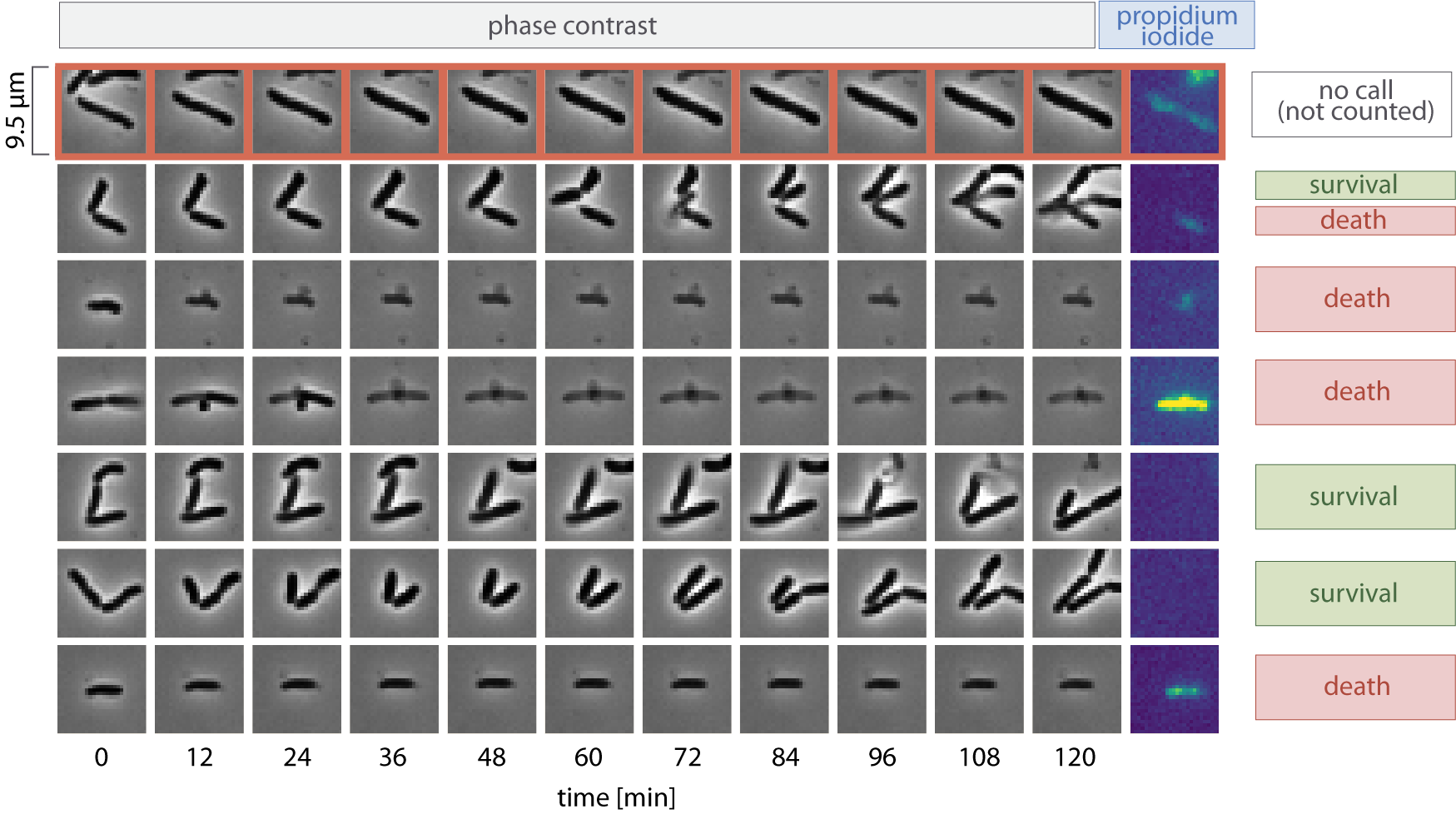 We defined a survival event as a cell that went on to divide at least twice in the several hours following the applied osmotic shock. In nearly all of our experiments, cells which did not survive an osmotic shock exhibited necrosis with loss of phase contrast, extensive blebbing and bursting of the membrane, and the presence of dark aggregates at the cell poles. An example field across time is shown below in Fig. 6 where the cells are necrotic. On occasion, we observed cells which did not obviously display the aforementioned death criteria, yet did not undergo one or two division events. These cells were not counted in our experiments and were not included in the final tally of survival versus death. Across our 2822 single cell measurements, such “no call” classifications were observed only 83 times, constituting only 3% of the total cell measurements. A breakdown of all classification types and their respective abundances can be seen in Table 9.1.