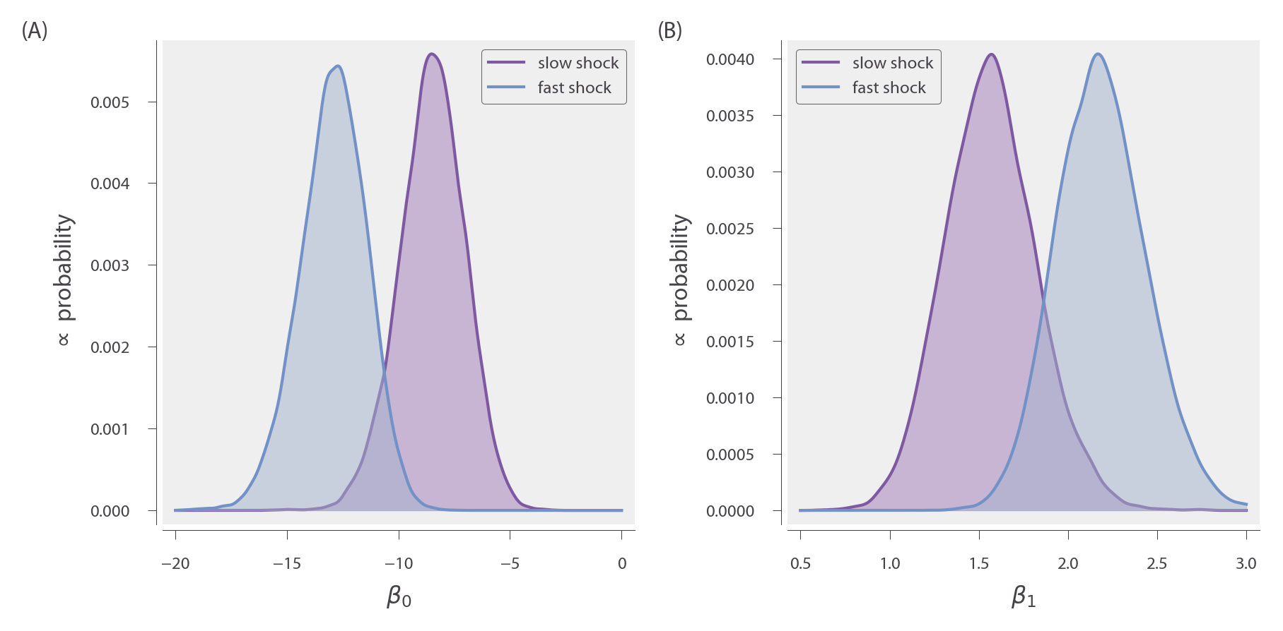 As this posterior distribution is not solvable analytically, we used Markov chain Monte Carlo to draw samples out of this distribution, using the log of the effective channel number as described in the main text. The posterior distributions for β0 and β1 for both slow and fast shock rate data can be seen in Fig. 8.