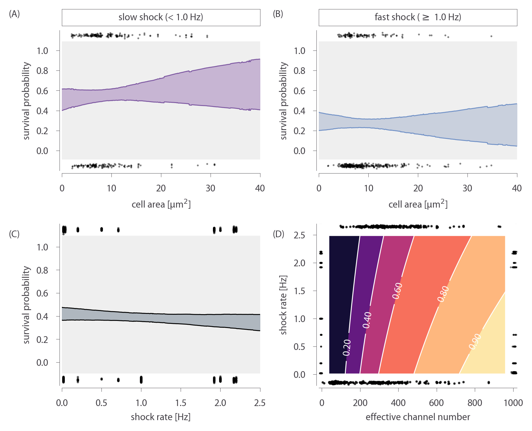 The previous two sections discuss in detail the logic and practice behind the application of logistic regression to cell survival data using only the effective channel copy number as the predictor of survival. However, there are a variety of properties that could rightly be used as predictor variables, such as cell area and shock rate. As is stipulated in our standard candle calibration, there should be no correlation between survival and cell area. Fig. 9 (A) and (B) show the logistic regression performed on the cell area. We see for both slow and fast shock groups, there is little change in survival probability with changing cell area, and the wide credible regions allow for both positive and negative correlation between survival and area. The appearance of a bottle neck in the notably wide credible regions is a result of a large fraction of the measurements being tightly distributed about a mean value. Fig. 9 (C) shows the predicted survival probability as a function of the shock rate. There is a slight decrease in survivability as a function of increasing shock rate, however the width of the credible region allows for slightly positive or slightly negative correlation. While we have presented logistic regression in this section as a one-dimensional method, Eq. 19 can be generalized to n predictor variables x as
